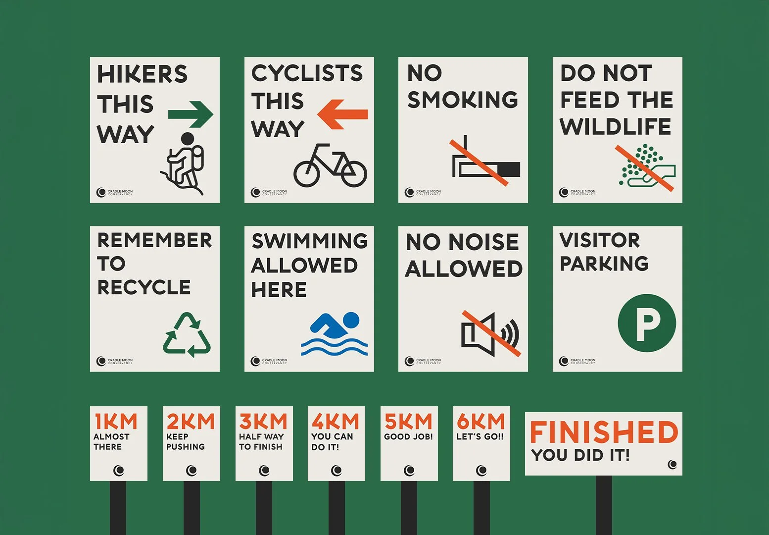 Wayfinding: The signage system utilizes the geometric language of the brand to guide visitors through the trails, emphasizing a "leave no trace" philosophy through subtle, integrated design.